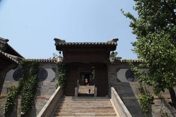 翻过一座拱桥,大家步入了“卧龙堡民俗文化区”。这里的英华书院和杨无敌祠傍山而立,一文一武相得益彰。汤河在这里拐了一个S型弯,一条支流贯穿其中,从曲折的河岸上剜出一片圆形岛屿,谓之“日月岛”。岛上建筑围成了一个中心广场,而最引人注目的当属广场北侧的密云大戏楼。戏楼如宫殿一般华丽壮观。台前横梁的精致雕刻,台上背景的仙人壁画,令人不禁在脑海中描绘出莺歌燕舞的华美影像。