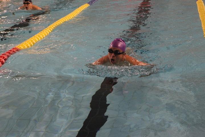 刘力平老师(前)在男子D组100米蛙泳比赛中