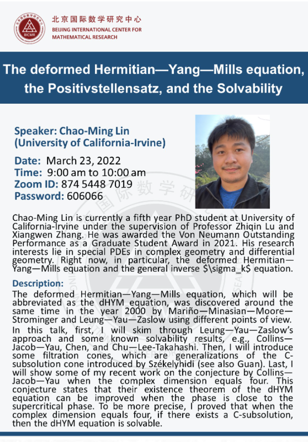 Chao-Ming Lin is currently a fifth year PhD student at University of California-Irvine under the supervision of Professor Zhiqin Lu and Xiangwen Zhang. He was awarded the Von Neumann Outstanding Performance as a Graduate Student Award in 2021. His research interests lie in special PDEs in complex geometry and differential geometry. Right now, in particular, the deformed Hermitian—Yang—Mills equation and the general inverse $\sigma_k$ equation. For more details about him, please visit: https://www.math.uci.edu/~chaominl/.