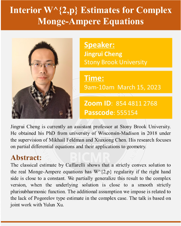 Speaker: Jingrui Cheng is currently an assistant professor at Stony Brook University. He obtained his PhD from university of Wisconsin-Madison in 2018 under the supervision of Mikhail Feldman and Xiuxiong Chen. His research focuses on partial differential equations and their applications to geometry.
