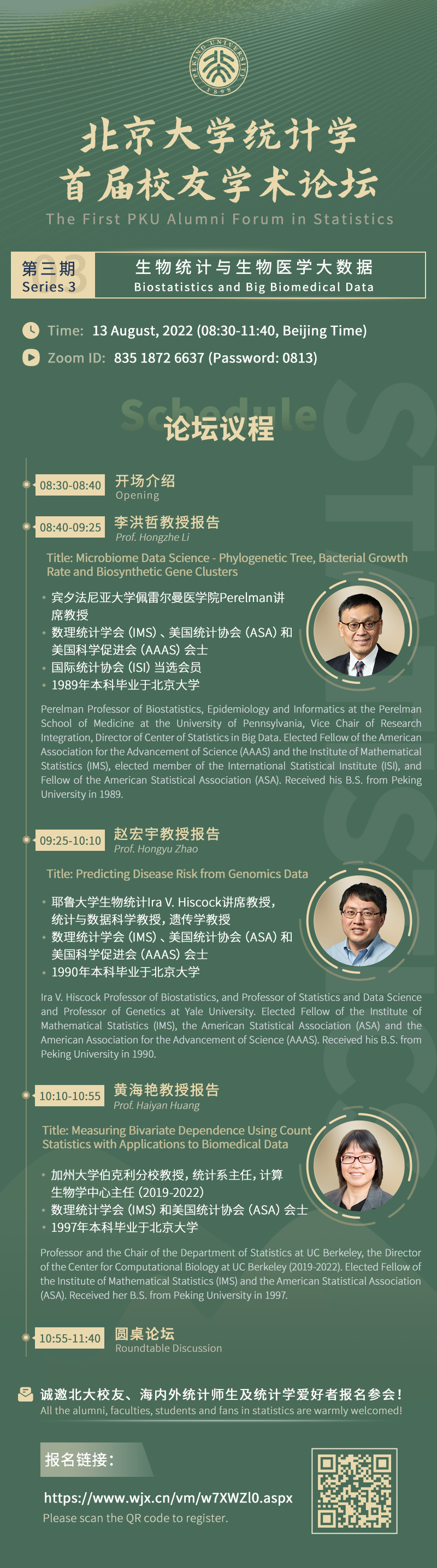 beat365中文官网统计学首届校友学术论坛第三期将于北京时间2022年8月13日上午举行,主题是:“生物统计与生物医学大数据” (Biostatistics and Big Biomedical Data)。本期将邀请宾夕法尼亚大学李洪哲教授、耶鲁大学赵宏宇教授、 加州大学伯克利分校黄海艳教授三位校友作报告分享,之后进行圆桌讨论。根据疫情防控要求,本期论坛将继续采用Zoom线上会议形式进行。