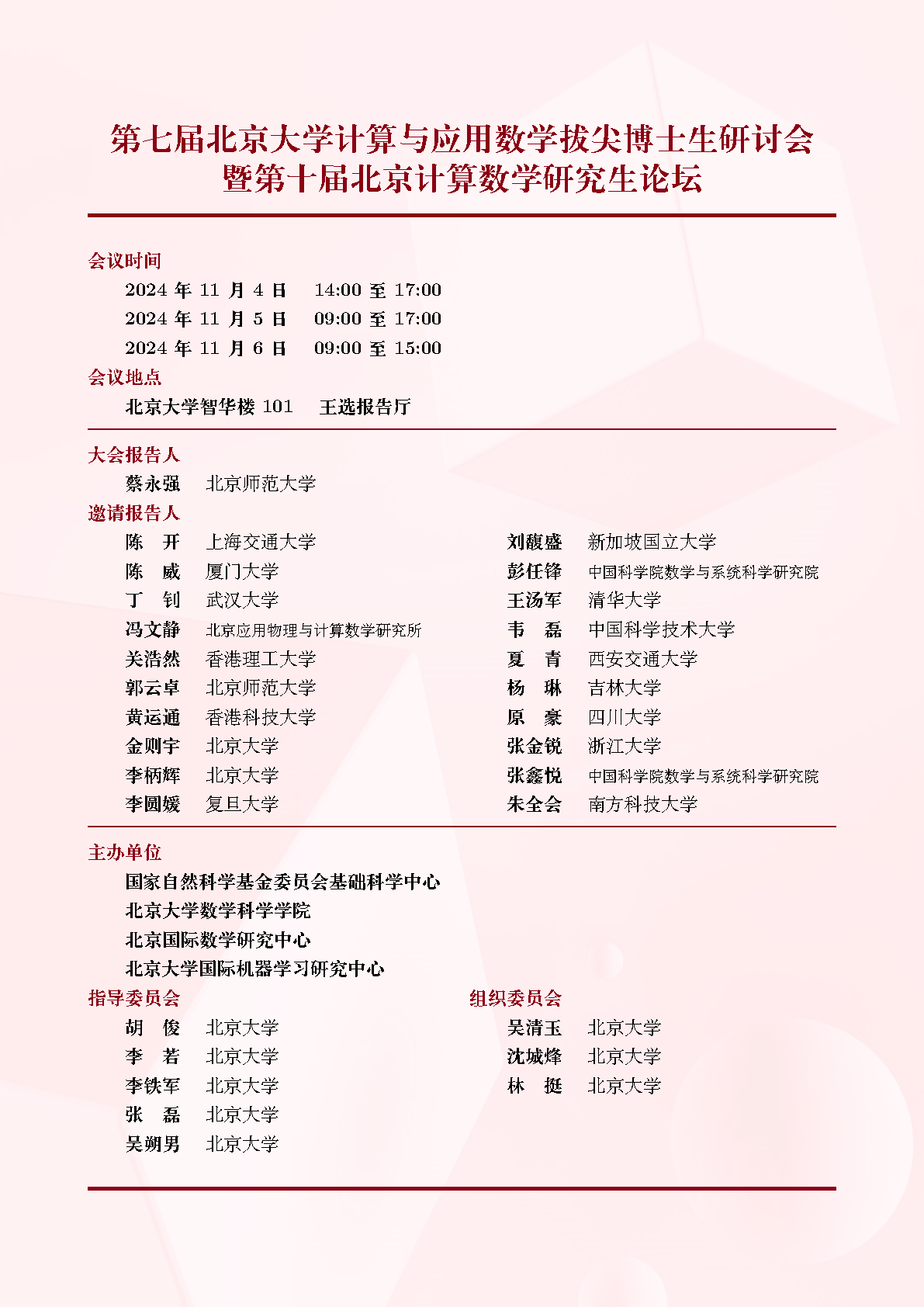 为了促进计算与应用数学领域优秀博士生之间的互学互鉴,为大家提供展示成果、相互学习、了解前沿和自由讨论的平台,第七届beat365中文官网计算与应用数学拔尖博士生研讨会暨第十届北京计算数学研究生论坛计划于2024年11月4日-2024年11月6日在beat365中文官网召开,目的是希望与会者通过该项活动,提高表达能力、拓宽研究视野、增强创新意识,进一步激发科研热情,树立攻坚克难的决心和信心,共同提高,一起进步。