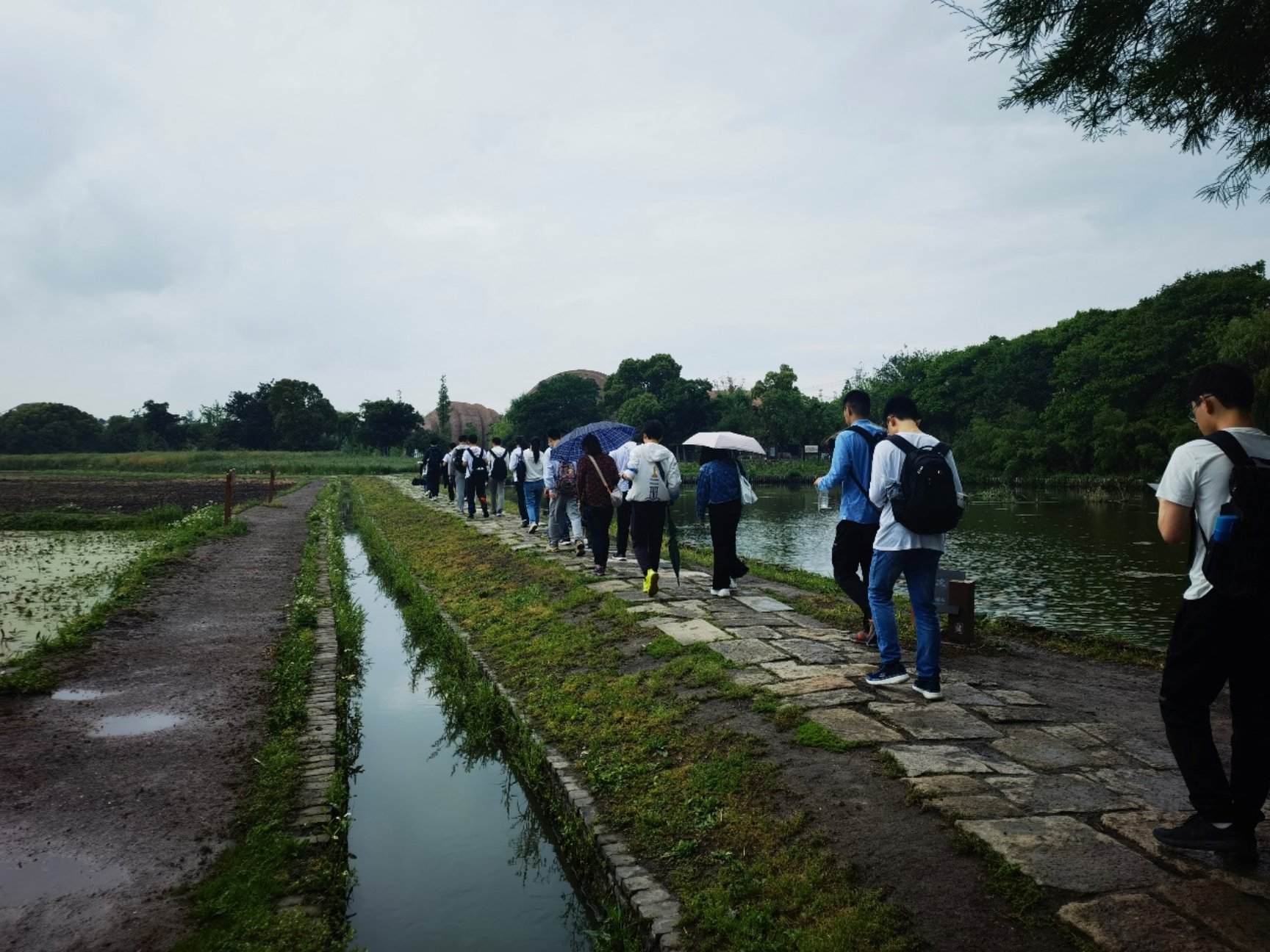 下午,实践团师生乘车来到松江,参观广富林遗址公园。这里展现了上海源自新石器时代晚期的悠久历史,也保留了明清时期江南书香门第的风韵。公园的水下展览馆通过复现的考古场景、挖掘出的实物和详细的解说词,生动地展示了松江地区从古至今超过3000年的文明发展历程,让同学们如同身临其境。同学们细心观摩着考古场景,充分了解了松江地区丰厚的文化底蕴,也深入理解了我国在重重困难下进行考古的特殊意义。在参观过程中,实践团师生还来到了陈子龙纪念馆前。陈子龙是明朝末年大臣、学者,是在抗清斗争中牺牲的民族英雄。追忆其文学成就与民族气节,同学们感受到了“星动上台临虎帐,剑随中使出龙楼”的民族大义,深刻认识到知识分子应有与国家同命运、共生死的情怀,也加深了对于爱国精神的理解。