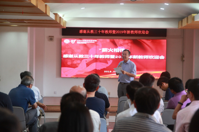 孙赵君在活动伊始表达了对从教三十年教师的感激之情,同时也对新入职教职工表示热烈欢迎。他说今天一个主题承载两件事情,表达了薪火相传的美好寓意,希望新教师们传承老教师们的风范,助力北大数学学科继续前进。