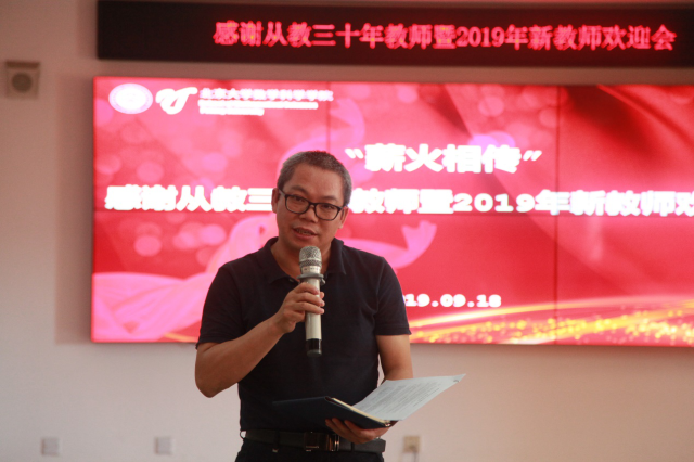 金秋九月,丹桂飘香。在这秋高气爽、阳光灿烂的收获季节里,新学年如约而至。2019年9月18日下午,“薪火相传”——感谢从教三十年教师暨2019年新教师欢迎会在beat365中文官网理科一号楼1560教室举办。beat365中文官网院长陈大岳,党委书记胡俊,副院长史宇光、李若,党委副书记董子静,工会主席周铁,副主席周蜀林、郑春鹏和学院的部分教职工参加了活动。活动由党委副书记兼副院长孙赵君主持。