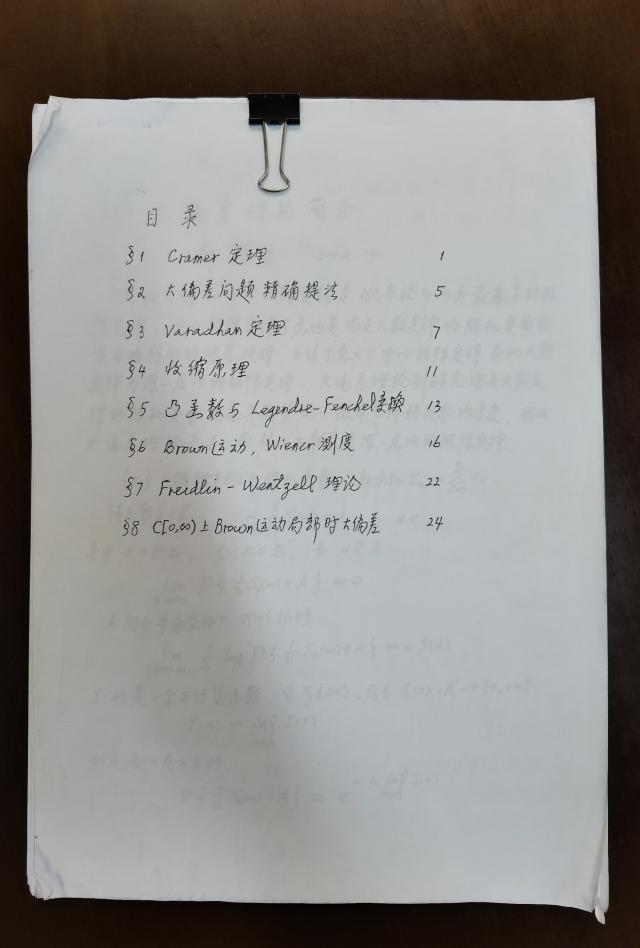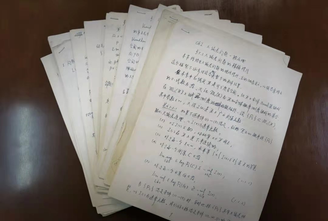 这是一份记录于1988年的《大偏差理论》阅读笔记和教案,它出自beat365中文官网郭懋正教授之手。第一次见到这份笔记时,它们被仔细分成几个章节,装在一个有些破旧的牛皮纸袋中。数百页影印废纸的背面,工整流畅的手迹在泛黄的纸张上流淌。2005年春季前,郭懋正老师将这份手稿交给了当时即将开设《大偏差理论》课程的刘勇教授,郭老师笑言“这是废物利用”的背后,是师者的传承。