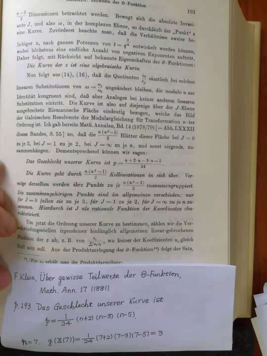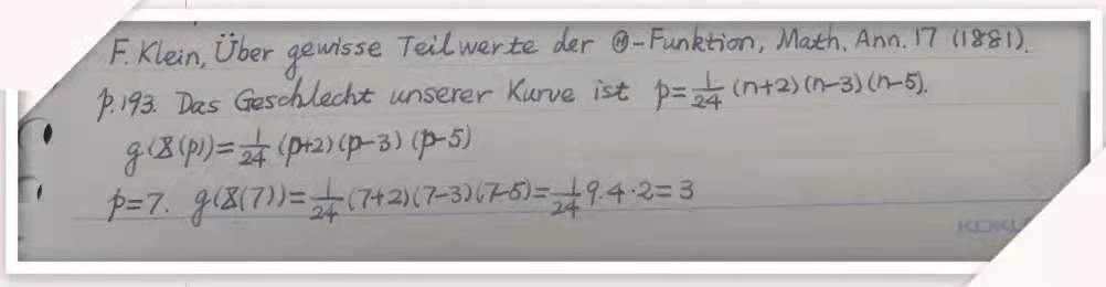 这是杨磊老师阅读过的一本书——《Felix Klein全集》第三卷,其中夹有很多这样的小纸片,他的其它书籍中也常有。小小的纸片足见杨磊老师早已形成的读书习惯。“书上空白小,我喜欢随时将自己的读书笔记写在小纸片上,夹在相应的位置,等读完后再重新整理在本子上。”
