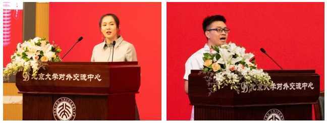 硕士新生代表、2021级硕士研究生王奔奔同学表达了自己作为一名北大新生激动的心情,他结合自己本科学习的经历讲述了他热爱数学的理性和严谨,他提醒同学们适应快节奏的学习生活,正视自己,为祖国发展做出应有的贡献。