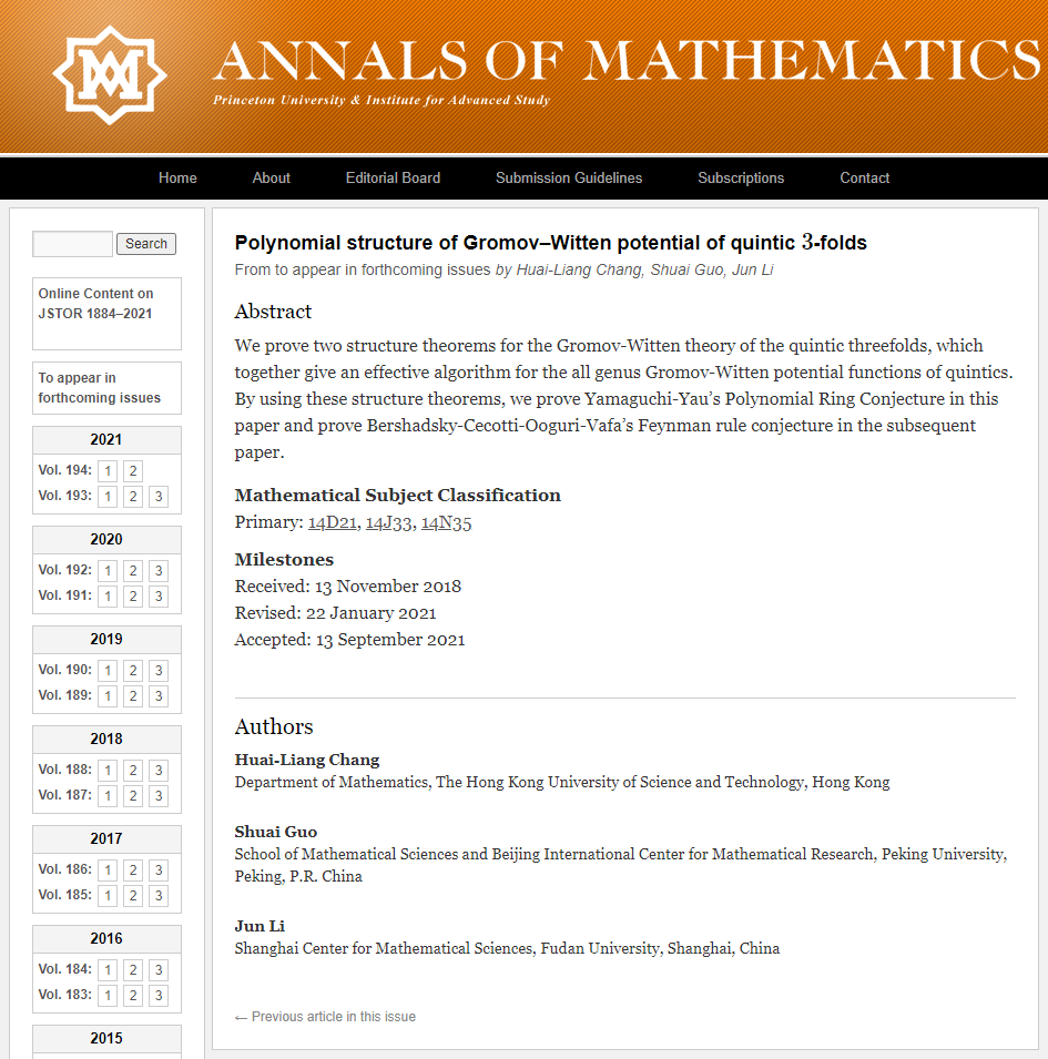 近日,beat365中文官网郭帅副教授与人合作在BCOV理论的A-模型结构方面取得重要突破。其论文“Polynomial Structure of Gromov–Witten Potential of Quintic 3-folds(五次三维流形的Gromov-Witten势函数的多项式结构)”被国际顶尖数学期刊Annals of Mathematics接收。