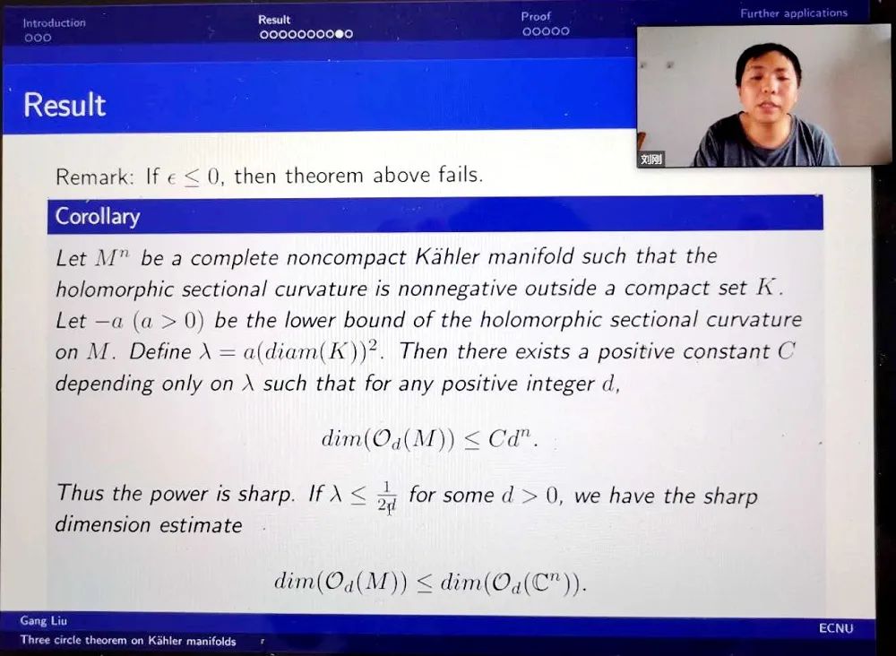 后来导师建议我研究单值化猜想。之前已经有了许多工作,但是我查看之后发现自己取得突破的可能不大,所以暂时搁置了。后来,在考虑一个全纯函数的Liouville问题时,我用了Li-Wang的一个比较定理,得到了一个非常简短的证明。后来发现,这个思路可以推广一下,得到Kähler流形上的一个三环定理。