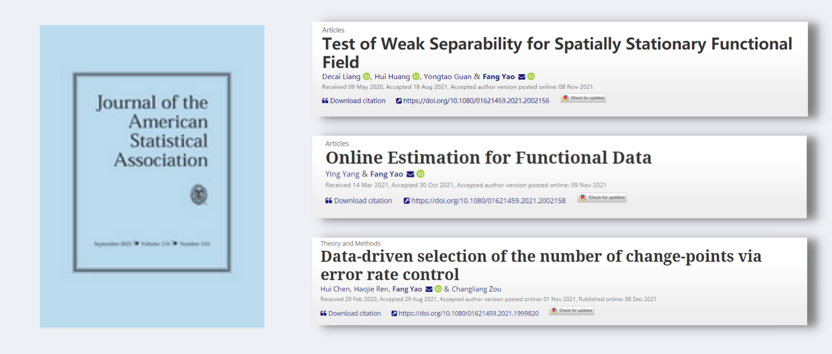 beat365中文官网与统计科学中心姚方教授团队近期在Journal of the American Statistical Association(JASA)同时在线发表三篇最新研究成果:[1]“Test of Weak Separability for Spatially Stationary Functional Field”,提出了新的针对平稳时空数据的弱可分性检验的方法和理论;[2]“Online Estimation for Functional Data”,实现了对函数型数据的可调参在线估计并大幅提升了计算效率;[3]“Data-driven Selection of the Number of Change-points via Error Rate Control”,通过保序分割的思想建立了数据驱动与错误率可控的变点个数选择新方法。这些成果对大数据分析中的时空建模、实时数据流在线学习以及复杂结构异变探查等前沿问题做出了原创性探索,具有重要的实际应用价值。
