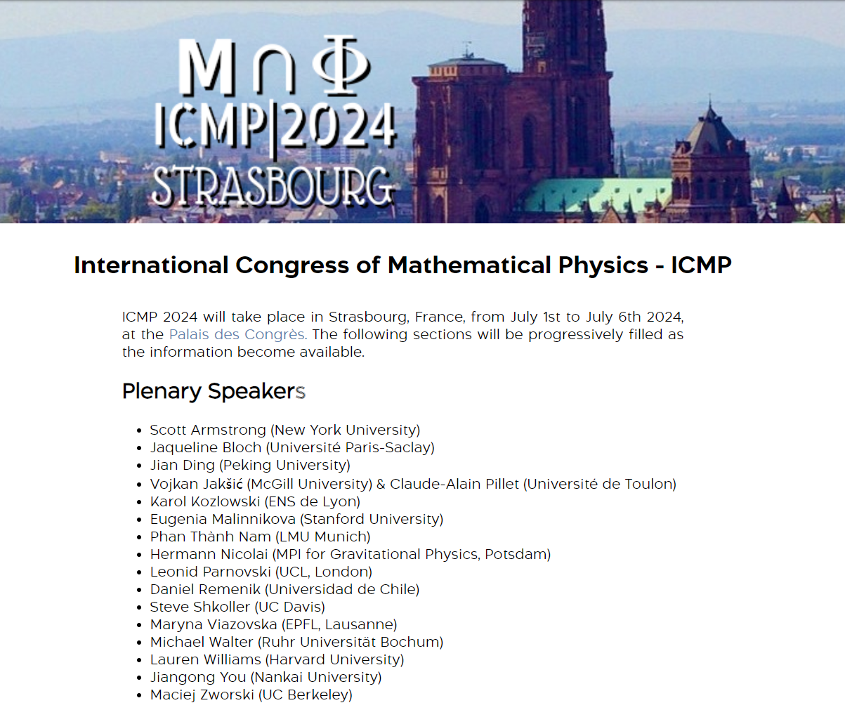 国际数学物理大会(International Congress of Mathematical Physics简称ICMP)1972年首次在莫斯科举办,1988年以来ICMP每3年举办一次,是国际数学物理联盟(International Association of Mathematical Physics)主办的最重要的数学物理领域的国际会议。2024年度国际数学物理大会(ICMP2024)将在法国城市斯特拉斯堡召开,往届大会报告人包括了菲尔兹奖、诺贝尔奖得主等许多著名数学家和物理学家。详见https://icmp2024.org和https://iamp.org
