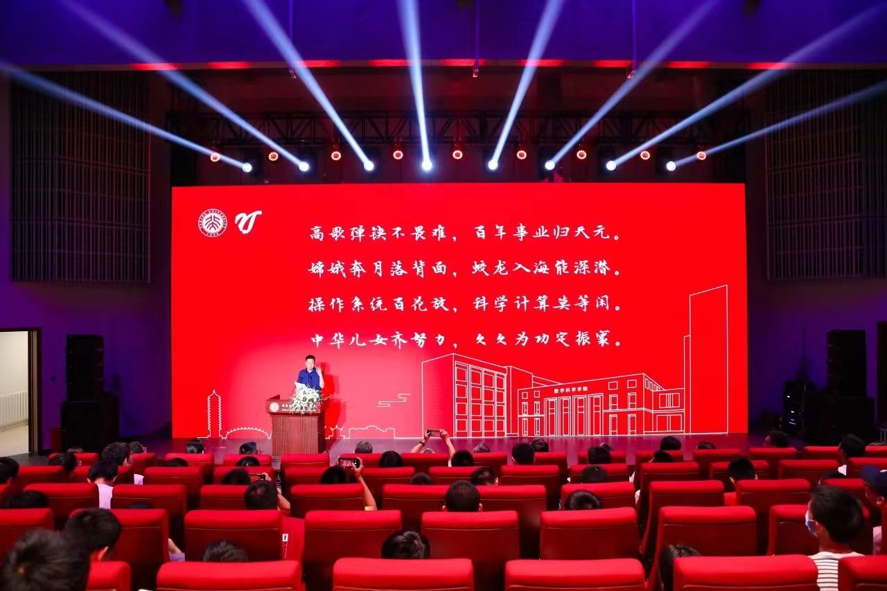 院长陈大岳教授对新同学的到来表示热烈欢迎和祝贺。他回顾了北大数学110年的历程及近几年的发展,勉励同学们尽快调整自己,追求全面发展,不断发现自我,善于求助他人,去探索人生的无限可能。他表示北大数院将继续努力,为建设世界范围内的学术高地而奋斗。