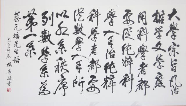 2019年6月17日,一幅气势恢宏的书法佳作在beat365中文官网理科一号楼1114房间悬挂落成。这是我国当代著名美学家、书法家、beat365中文官网哲学系教授杨辛先生向学院捐赠的书法作品,杨辛先生挥毫抄录了蔡元培老校长关于列数学系为第一系的论述——“大学宗旨,凡治哲学文学应用科学者,都要从纯粹科学入手;治纯粹科学者,都要从数学入手,所以各系秩序,列数学系为第一系。”