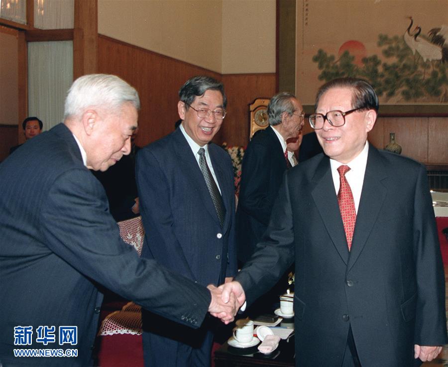 2002年2月8日,中共中央在北京中南海举行党外人士迎春座谈会。这是江泽民同志和丁石孙同志握手。 新华社记者 兰红光 摄